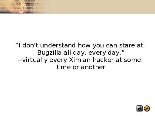 So, who am I? My best bet is that over the past two years I've read on the order of thirty thousand bug reports, and systems I 'run' have handled on the order of 75K bugs. I got into Linux because I'd heard it didn't crash, and it pissed me off when it did. So I've spent two years full time (and as a volunteer with Mozilla before that) making Evolution and GNOME more stable.