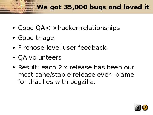 So why did bugzilla and a QA process succeed for GNOME? Our open bug count has stayed nearly level or gone up for 18 months, our total bug count will hit 120K soon. If you're not paying attention that probably sounds like complete, embarassing failure. It's not perfect, but I'm still pretty proud of it. :)